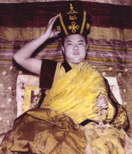 While still residing in Derge, when he was eight years old he received the Vajra Crown and ceremonial robes of the Karmapa brought to him from Tsurphu. On the way to Palpupng Monastery, he stopped to visit and bless the Derge Monastic Publishing House, foreshadowing his publication of the Buddhist cannon in India. T’ai Situ Rinpcohe enthroned him as the Sixteenth Karmapa, Rangjung Khyabdak Rigpe Dorje, by Tai Situpa. Tai Situpa then accompanied him on the long journey to Tsurphu, the seat of the Karmapas in central Tibet, where the new incarnation was greeted by Goshir Gyaltsab Rinpoche, Jamgon Kongtrul Rinpoche and Nenang Pawo Rinpoche.